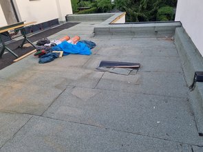 Spengler haben heute die 25. Abdichtungsebene auf die Dachterrasse geschweißt. Im Ernst: die Seitenteile fertig mit Selbstklebebahn beklebt und dann mit wurzeldichter Schweißbahn verschweißt. Was für ein Aufwand!