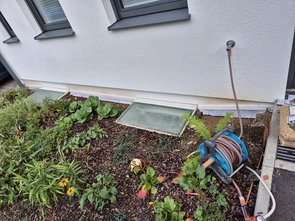 Heute Malereinsatz auf anderer Baustelle gehabt. Danach noch bissl was geschafft: Noppenbahnabdeckung die fehlenden drei noch montiert - vorher Noppenbahnzuschnitte an die bestehende Noppenbahn angearbeitet - und gleich für die Kiesfangleiste einen kleinen Graben geschaufelt.