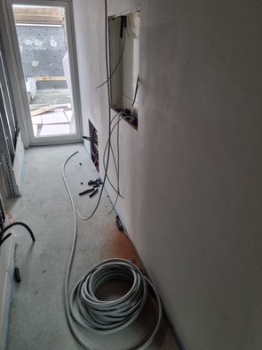 Damit ich heut noch was produktiv mach, bissl Elektro weiter. Außer zwei Stromkabeln im OG aber kein Erfolg, im Gegenteil: saublöde Sache! Die dicke Leitung vom Zählerkasten zur Verteilung im OG ist zu verdammt dick für das Leerrohr. Sollte laut Elektriker passen... Hätte damals ohne Probleme noch eine Größe größer bestellen können. Ging aber halbwegs. Problem ist: etwa 1 m vorm Ziel geht das Leerrohr nicht durch. Auch das Durchzugskabel geht nicht durch.