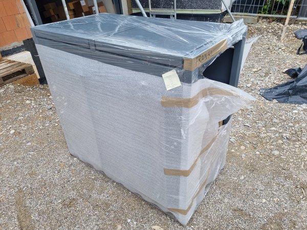 Mülltonnenhäuschen ist gekommen. Echt chic. Zum Glück haben wir das kleine genommen. Das große wäre echt zu groß geworden!