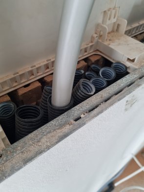 Muss ich morgen schauen, ob ich mit der Endoskopkamera hinkomm. Ansonsten: Wand aufstemmen :-( Zum Glück an einer ziemlich unproblematischen Stelle. Ist zwar schon verputzt, aber gut öffenbar und ohne Problem wieder nachputzbar.