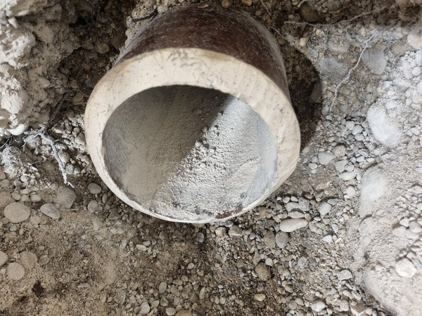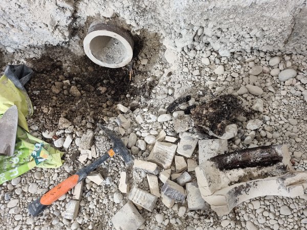 Kanal Eder kam in der Früh zufällig vorbei, damit er seinen Anhänger schon mal für morgen herstellen konnten. Dann der Schock: die Steinzeugmuffe soll weg, damit der Inliner gscheit gesetzt werden kann :-( Horror! Panik! Wenn das Ding bricht, ist die Hölle los!