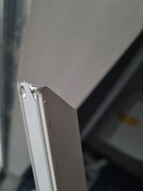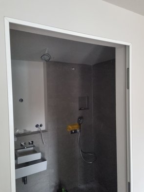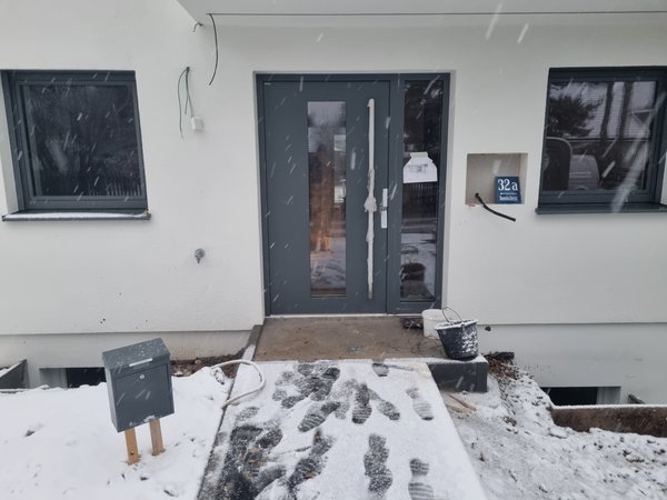 Momentan kann man von der Straße ja noch ins EG-Bad schauen. Heute mal den Türrahmen eingebaut, war zum Glück kein Problem. War zwar etwas verbogen vom Ausbau, aber ging wieder gut rein :-)