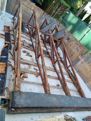 Mein dritter Job heute war die Demontage des alten Dachs. Nachdem ich gestern schon leicht euphorisiert war, dass es nicht so schlimm wie befürchtet läuft, heute die nächste angenehme Überraschung: mit bisschen Übung gehts noch schneller als gestern - und auch die verblechten Seitenteile gingen mit überschaubarem Mehraufwand. Das erste Dach ist schon 90% abgedeckt.