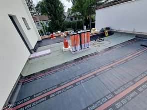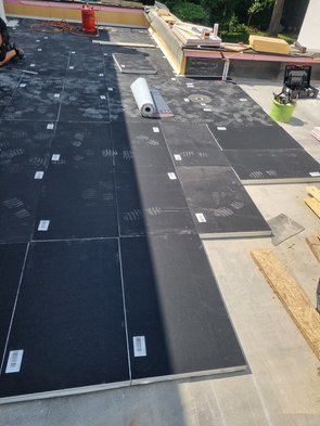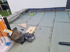 Nach der Vakuumdämmung haben wir die Einläufe positioniert, befestigt (x Mal eingedichtet), dann die erste Abdichtungsbahn (selbstklebend, damit drunter nix heiß wird) und dann eine Schweißbahn und die Anschlüsse alle mit Flüssigkunststoff. Den Notüberlauf konnten wir rausziehen (gut, dass ich wusste, wie der einbetoniert ist, ging einfach rauszuziehen :-) Ich habe dann noch mit der Seitendämmung am Haus angefangen, nachdem die Befestigungsleisten der Schweißbahnen dran waren.