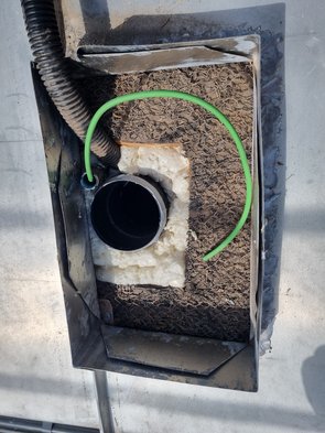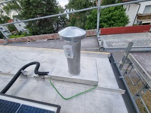 Abdichter waren zu viert da, einer hat das "Hüterl" gemacht: Dachentlüftung Sanitär, KNX-Kabel und Dämmerungssensor. Erstmal haben wir den Dummystutzen raus. Ging zum Glück erstaunlich einfach raus. Den hatte ich von unten nicht rausgebracht :-( KNX-Kabel ging auch problemlos rein :-). Dann Holzfaserdämmung reingestopft und fischer Premium-Flex-Schaum rein. Wenn das nicht winddicht ist, weiß ich auch nimmer! Danach