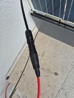 Wechselrichter fertig an die Wand gedübelt und gleichstromseitig angeschlossen. Gutes Wetter genutzt, die Stecker oben auf der Dachterrasse zu montieren und anzuschließen.
