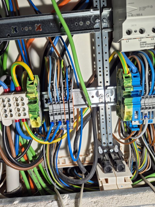 Ganz einfach: die beiden rechten Reihenklemmen sind die Drähte der Außensteckdose. Gut, dass ich mir ein paar Reihenklemmen mit Nullleiter auf Reserve gekauft hatte. Hier hatte ich wieder einen gebraucht. Die sind jetzt auf den FI/LS für außen angeschlossen und damit muss ich künftig nimmer das Kabel durch die einen Spalt geöffnete Esszimmertür rauslegen - und jedes Mal Angst kriegen, dass ich es zu weit offen lassen und die Mädls rausrennen vsl. Kabel gequetscht.
