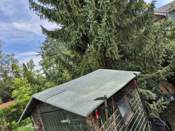 Philipp hat mir während seines Urlaubs seinen Flammwerfer geliehen und letzte Woche kam die Schweißbahn. Also Leiter geholt und Schweißbahn zugeschnitten und aufgeschweißt. Hatte dabei zwar schon 100 x zugeschaut, aber noch nie selber gemacht. Ist echt ned so kompliziert. Kompliziert war nur, dass die Untersicht kleben bleibt. Also zwei Holzlatten eingespannt. Hütte hat auch überlebt, ohne dass sie abbrennt. Von der Fichte habe ich auch nur ganz wenig abgeflammt.