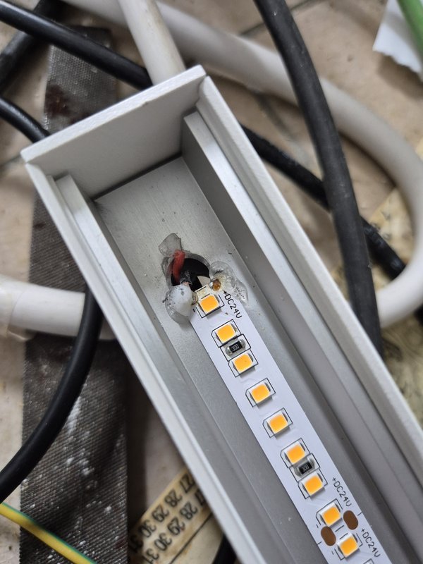 Danach musste das DALI-Problem ja lösbar sein. Dank neuem WAGO-Auflegetool ging das Testen an den Reihenklemmen gleich mal paar Prozent schneller :-) Busspannung gemessen: alles ok, bis in die Küchenleuchte. An sich ja schön, aber warum geht dann dieser verdammte DALI-Bus nicht??? Also warm angezogen und in der Garage die ganzen Leuchtenkartons ausgepackt und eine kleine Leuchte zum Test rausgesucht. Angeschlossen, geht nicht. Hurra! Offenbar beim Auspacken eine Lötstelle kaputt. Zum Glück hab ich Lötgerät bei Mama wieder gefunden. Also schnell gelötet (und mein Lauf-Sicherheitslicht auch gleich repariert). Dann ging die Leuchte. Aber leider noch immer findet das DALI-Steugerät es nicht. Stundenlang experimentiert, Firmware-Update, Reset-Versuche, Neuprogrammierung. Am Schluss noch zwei Youtube-Videos geschaut und fast schon in die Tischkante gebissen. Also muss es an der Verdrahtung liegen. Fünf Varianten probiert. Und dann an eines der Videos erinnert, wie der verdrahtet hatte. Alles richtig bei mir, habs auch so.