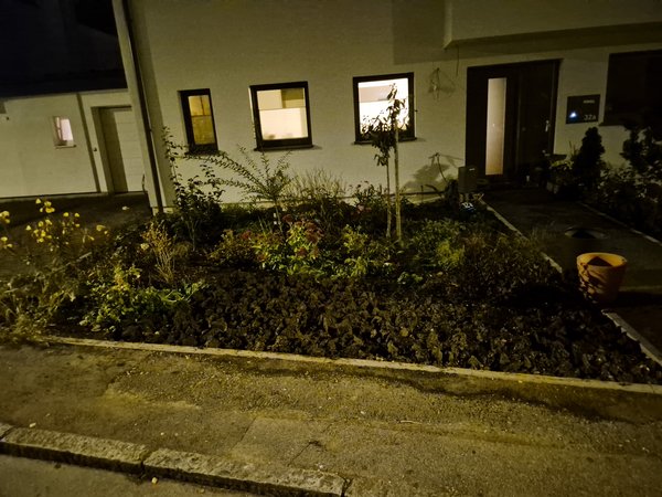 Wie das alles zusammengehört? Ganz einfach: ich hatte die übrigen Terrassenplatten auf Kleinanzeigen inseriert. Hat sich jemand gemeldet, dass er gerne einen Teil hätte. War mir ganz recht. Bissl Mittagsessensgeld und trotzdem noch genug Reserveplatten in der Garage. Sein Papa wohnt wenige Kilometer entfernt. Termin vereinbart. Plötzlich stand der Bürgermeister einer Nachbargemeinde vor der Tür! Hab bei Kleinanzeigen ja schon viel erlebt, aber das war echt lustig. Hab danach dann gleich die Palette weggeräumt, auf der die Platten standen und auch die Schaldeckel als Unterlage drunter aus dem Beet raus, gesäubert und aufgeräumt. Dann war es wieder ein Beet. Habe dann noch halbe Stunde umgestochen, dass wir da die nächste Zeit die Bepflanzung ergänzen können und vorne ganz fertig wird.