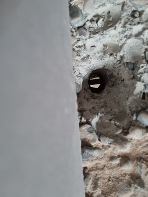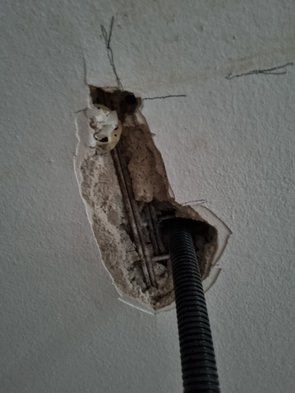 Damit unsere Super-Artemide Strom auch leuchten kann, muss noch Strom dazu. Mitte vom Wohnzimmer ausgemessen und mit dünnem Bohrer hochgebohrt (dank Kärcher-Absaugung fast staubfrei). Leider genau unter der Zwischenwand im OG rausgekommen. Also paar Zentimeter weiter östlich. Immer noch zu knapp. Dritter Versuch hat dann geklappt. Leider hat die Decke an dieser Stelle aber ungewöhnlich viel und vor allem dicken Stahl drin. Ist von unten dann volle Kanne ausgebrochen.