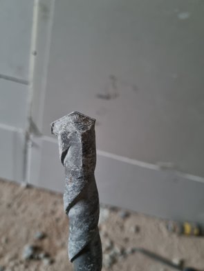 Der Bohrer hat irgendwann auch einen Schaden abbekommen, oben fehlt eine Seitenflanke. hagebau-Setglumpp (der teure Boschbohrer ist irgendwie verschwunden - aber auch der hätte diesen Stahl nicht durchbekommen).