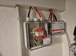 Also selber noch alles vorbereiten: Fotovoltaikleitungen von den Dachterrassenmodulen schön in die Kabelkanäle gelegt, die Überspannungssicherung (links) angebohrt und Anschluss vorbereitet.