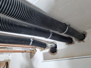 Heizungsbauer hat heute die letzten Lüftungsrohre durch die Wand gestemmt und angeschlossen. Nur im Fitnessraum muss jetzt noch an die Decke gebohrt werden. Das geht aber erst, wenn Estrich drin ist und mit Leiter belastbar ist.