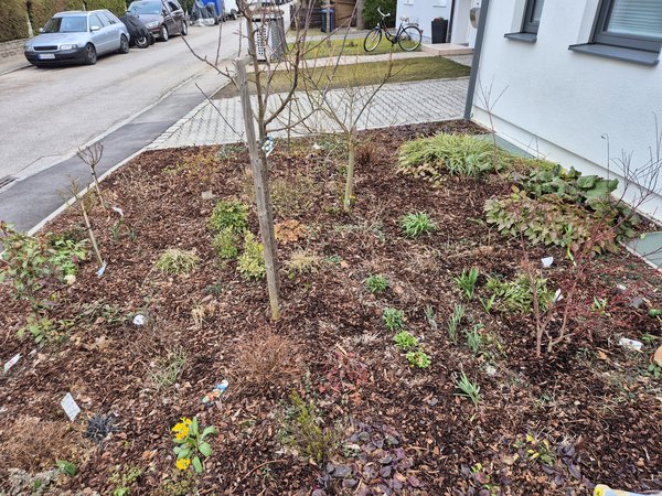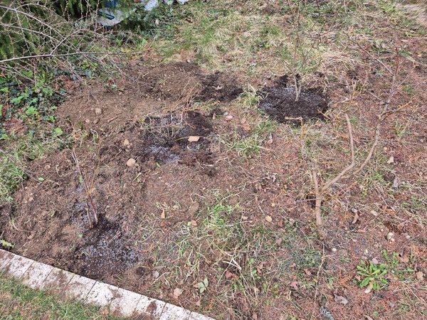 Blaubeeren haben wir ausgepflanzt und ihnen Moorbeeterde (wenigstens kann ichs richtig schreiben, hab ich heut den ganzen Tag Moorbeetede oder Morberterde ausgesprochen). Hoffentlich kommen die dieses Jahr gscheit. Hat leider auch nicht gereicht. Wenigstens hat der Rosenmulch gereicht.