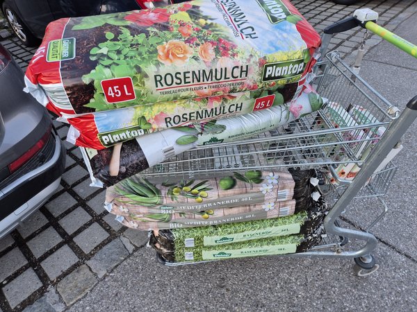 Die letzten Tage viel eingekauft: Vorgestern zu Obi gefahren, weil die den Mährobotor mit 8% App-Rabatt hatten. Gestern bei Dehner Dünger, Erde und Mulch geholt und auch noch den Nachbarn die Einfahrt als Dankeschön gekärchert, dass wir da dämmen etc. durften.
