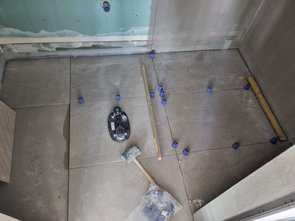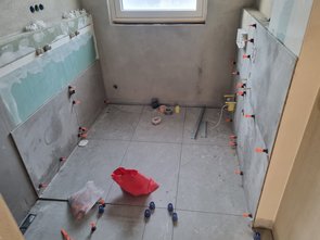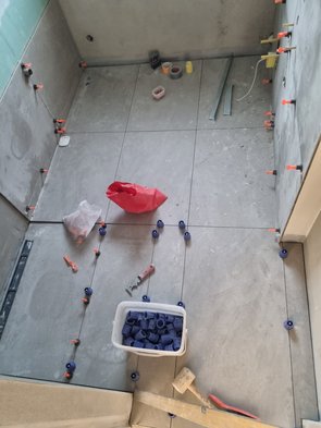 Danach gleich die Duschnische im EG montiert. Haltescheiben (18 Euro Material plus 25 Euro Versand) und Schrauben (8 Euro) - teurer Spaß. Millimetergenau ausgemessen, dass die Duschnische genau mit der Fliesenoberkante abschließt.