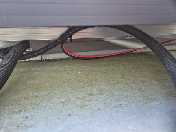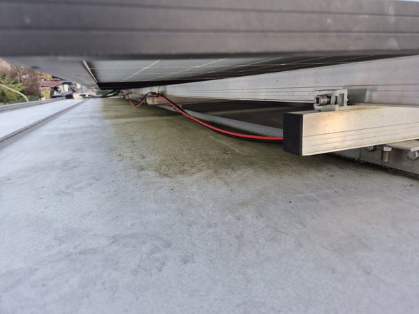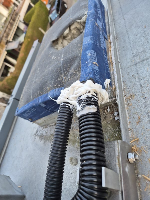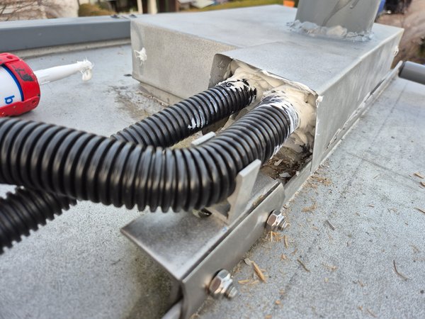 Und dann Teil 2: KNX-Dachsensor angeschlossen. Dazu ist mir eine gute Konstruktion eingefallen: erst das 25-er Leerrohr mit Fotovoltaik-Kabeln und KNX-Kabel unter die Dachmodule gezogen und dort dann das KNX-Kabel in ein dünnes Leerrohr eingezogen, das ich dann direkt an den Sensor geführt habe. So ist ein bisschen mehr UV-Schutz gegeben (aber ohne, dass was eingeklebt ist).