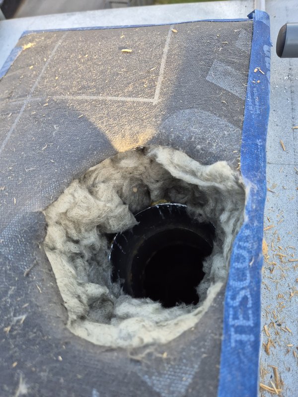 Danng ings ohne Mittagspause aufs Dach. Ich hatte mir gestern überlegt, dass ich die Holzfaserdämmung in dem Aufsatz des Dachlüfters lieber gegen die eh in der Garage lagernde Stopfwolle zu tauschen. Ganz leicht feucht war die an einer Stelle nämlich schon. Sicher ist sicher.