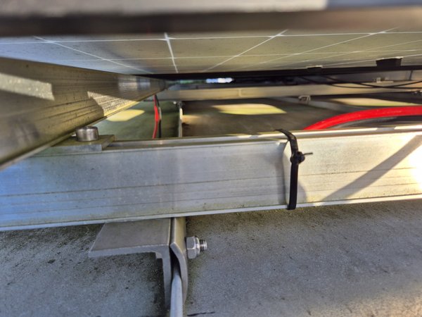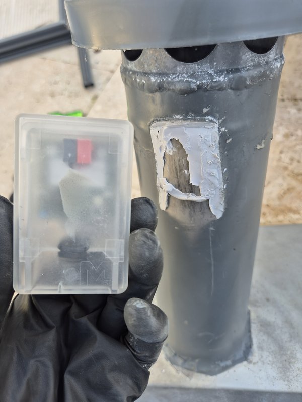 Nächster Schritt war dann den angeklebten KNX-Sensor entfernen ohne ihn zu beschädigen. Wieder der Super-Kleber. Habe dann einen Holzklotz aus druckimprägniertem Holz mit uv-beständigem Kabelbinder angebunden und dort den Sensor eingeschraubt. Das ganze dann mit dem zum Glück noch vorhanden bastaltgrau-Spray alles nachlackiert und auch die Stellen, an die ich damals bei der Montage (war schon vernietet) nicht rangekommen bin.