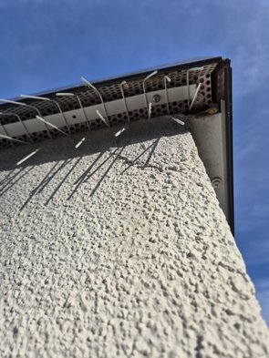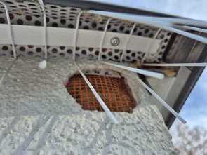 Nach kurzer Unterbrechung an anderem Haus Spechtloch geschäumt und mit Blech zugeklebt, zurück und das Spechtloch bei mir Gewebe rein und Putz drauf. Obwohl der Putz noch feucht am Foto ist, sieht man das Loch jetzt schon kaum mehr.