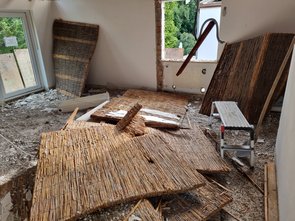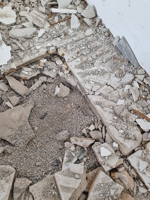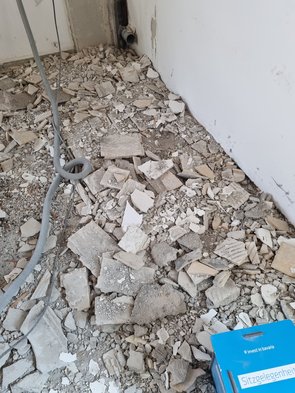 Jetzt noch den wirklich letzten Estrich gestemmt: im ehemaligen Bad. Zum Glück keine große Fläche und vor allem: keine Mineralwolle drunter :-) Dafür irgendein komisches, kieseliges Schüttzeug.