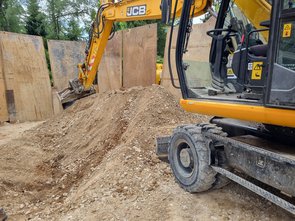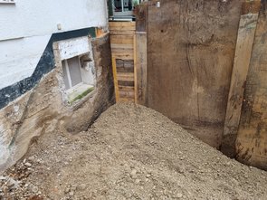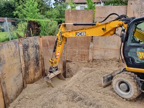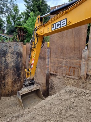 Foto mit der Baggerschaufel, dmait man sieht, wie tief die Grube schon ist! Heftig! Da direkt ans Haus kein Träger gesetzt werden kann, musste das Stück zwischen letztem Träger und Haus von Hand mit Holz geschalt werden.