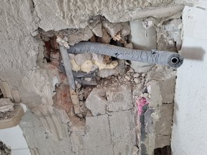 Auch gleich noch an der Wand aufgestemmt und die Leitungen freigelegt. Man beachte das neue Rohr (mittelgraue Dämmung): im Bogen in der Wand!