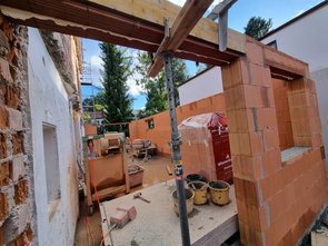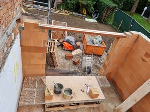 Die Außenmauern sind fast fertig gemauert. Der Sturz über der Haustür ist schon gesetzt und oben drüber geschalt und betoniert.
