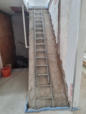 Heute nur Mittag mal rüber, den Heizlüfter aktiviert, dass Schlafzimmer schneller austrocknet. Das Nord-Westeck ist leider immer noch recht feucht. Leider scheint die (fast neue) Kabeltrommel eine Macke zu haben. Müsste 3,3 kW aushalten, schaltet aber nach halber Stunde 2,4 kW Heizlüfter auf Thermosicherung :-(