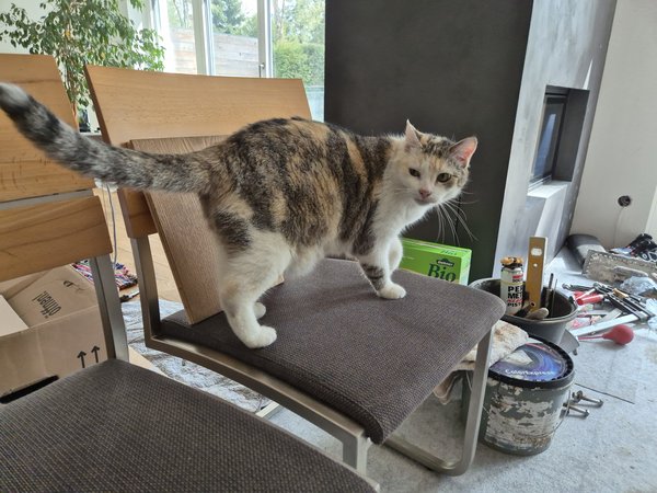 Heute nach Puchheim gefahren. Ganz schön gezogen. Da hatte jemand sechs Stühle mit Holzlehne von Wössner im Angebot. Zwar nicht reines Holz, aber demontierbar, falls die Katzen das Polster mal verkratzen. Das war ein echter Schnapper, sind voll geil.