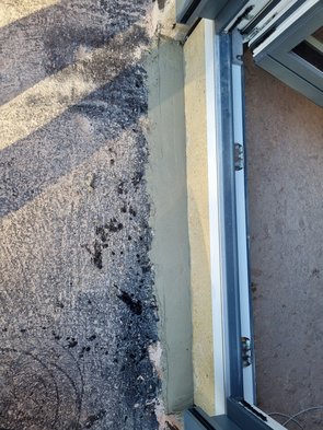 Damit er randichten kann, durfte ich dann noch schnell die Stelle zwischen Dachterrasse und Fensterunterbau zumörteln. Hat genau nicht gereicht, wir brauchen aber eh das Material auch für die Innendämmung.