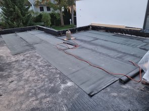 Hat angefangen, die Holzplanken auf die Attika zu schneiden. Und dann die Hauptfläche der Dachterrasse.