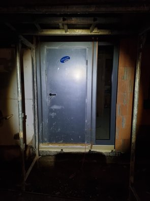 Fensterbauer hat die Haustür fertig gemacht und wir haben den Türflügel in die Tiefgarage getragen. Jetzt sind wir "dicht" und haben auch vorne eine Bautür :-)
