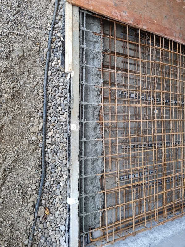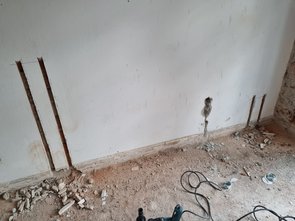 Ich habe vom Boden nochmal leichte Unebenheiten abgestemmt und alle Schlitze für Strom und Netzwerk geschlitzt und freigestemmt. Dann wird zunächst Klebemörtel auf die Wand gespachtelt. Danach kommt dann auf die (ggf. für die Leerrohre ausgeschnittene) Dämmplatte Klebespachtel. Dann wird die Platte an die Wand geklebt, bissl eingeschwommen, ausgerichtet und die nächste Platte. Fünf Platten drei Stunden - mit allem Herrichten und vorbereiten etc. Wird jetzt dann sicher viel schneller gehen - und bei den höheren Ebenen gibt es ja keine Stromauslässe mehr.