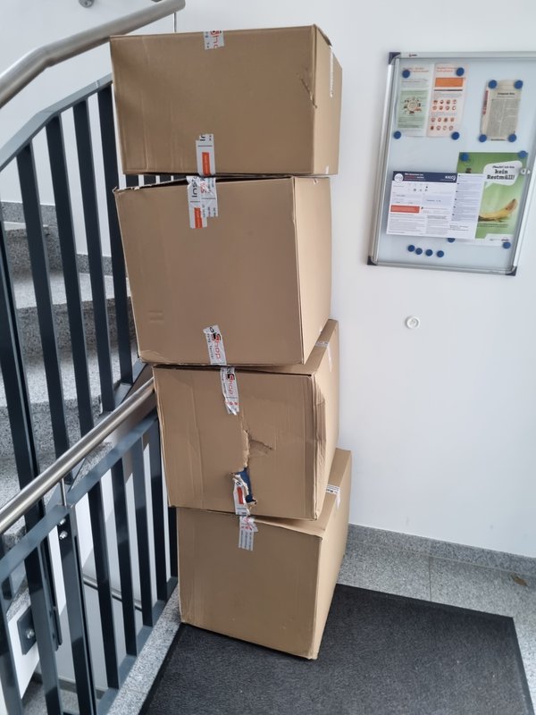 Gleich drei wichtige Lieferungen heute: zuerst brachte GLS die Randdämmstreifen. Selbstklebefunktion ist leider sehr schwach :-(