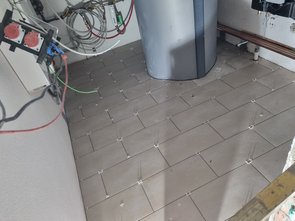 Fliesenleger wollten eigentlich 2-3 Tage aussetzen, weil sie einen anderen Auftrag haben. Waren heute aber doch da. Haben die Stufen in den Kellerfluren gemacht und den Heizkeller. Das war eine ganz schöne Ausschneiderei mit dem Pufferspeicher und dem Ausdehnungsgefäß.