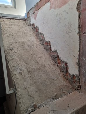 Treppe ins OG mit Baufirma besprochen. Wahrscheinlich kann ich die Stufen komplett erhalten. Nach dem Termin noch eine Runde gestemmt und gut die Hälfte noch gleich ganz rausgebaut, inkl. Entfernung Sisal. Drunter sind ganz schöne Mengen Mörtel.