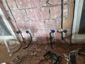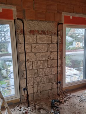 Steckdosen musste ich die Schlitze neu machen. Immer mit Zugang und Abgang, damit alles über den Fußboden gezogen werden kann und wenig Querschlitze in den Wänden sind. Bin recht weit gekommen. OG ist zu 90% fertig.