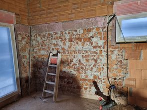 Die Jungs haben die Fenster abgeklebt, Schienen an die Fenster geklebt, Putzschienen gesetzt, die Innentüren abgeklebt. Beton und kritische Flächen haben sie dann mit einer rosa Grundierung gestrichen. So kriegt man auch "Mädchenzimmer" ;-)
