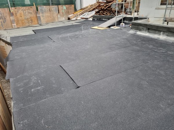 Kaum war die Bautenschutzmatte verlegt und das restliche Holz und wieder zwei Wannen Bauschutt ins Auto geladen, fings an zu regnen. Und wie! Über eine Stunde volle Kanne! Man beachte hinten in der MItte den Wasserstrahl aus dem Regenrohr"schlauch"!