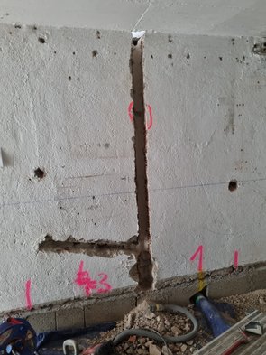 Bei den Demontagearbeiten vorgestern hat Peter den Küchenablauf entdeckt. Da dort auch das Waschbecken dran hing, rausgestemmt (auch wenn Baufirma/Architekt aufgrund der tiefen Montagetiefe in der Wand abgeraten hatten - aber jetzt ist ja stabil unterfangen). Von oben auch gleich freigestemmt und die drei Leitungen (auf der Rückseite) rausgestemmt.