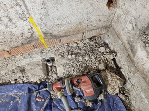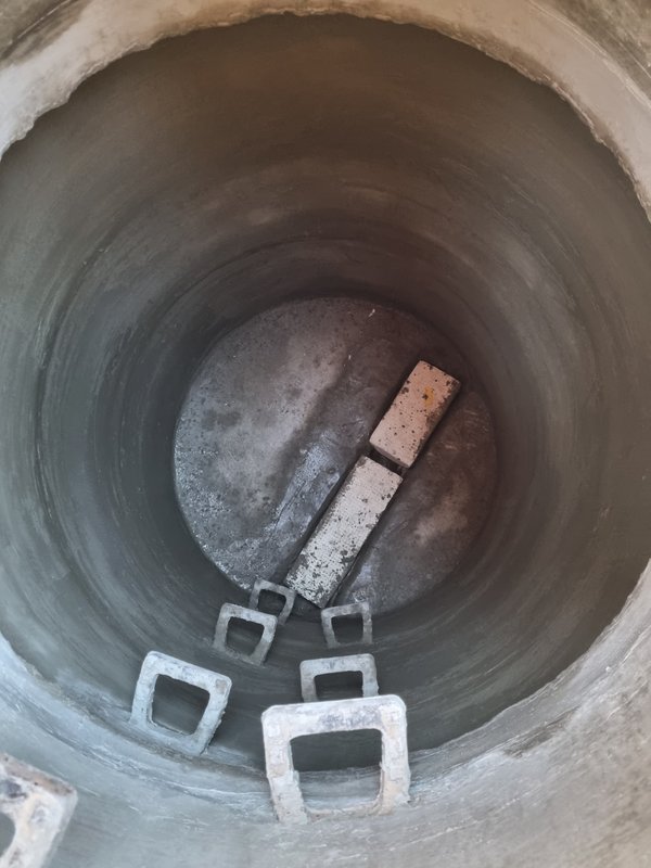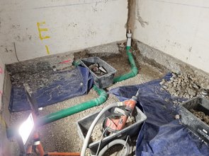 Kanalschacht ist fast fertig. Das alte Rohr wurde rausgestemmt und durch neue (offene) Rinne ersetzt. Alte Fugen wurden rausgekratzt und mit neuem Mörtel ausgefüllt und mit Dichtschlämme eingeschmiert. Jetzt muss alles trocknen.