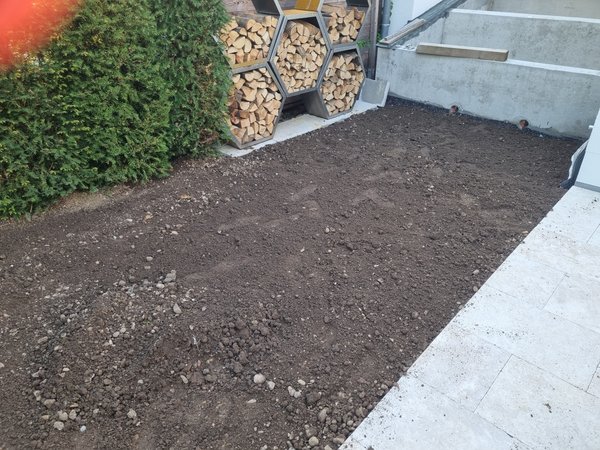 Der Löwenzahn hat sich vom Mähen von der ersten Ausstechrunde und vom Rasenmähen noch nicht restlos beeindrucken lassen. Also nächste Runde: einen ganzen Sack ausgestochen und auch das Unkraut, das unter der Lärche auf dem Kies vom alten Garagendach gewuchert ist, ausgestochen.