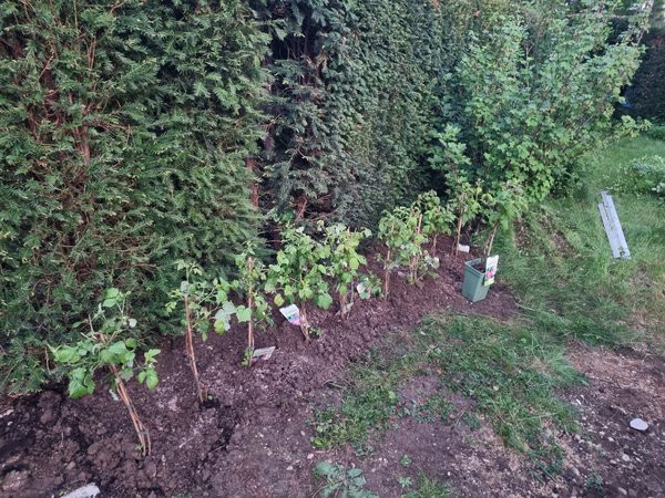Nachdem Aldi letzte Woche so schöne Himbeerpflanzen hatte, habe ich mir zwei mitgenommen und Mama hat mir noch eine nachgekauft. Als ich dann am Mittwoch im Aldi Neuperlach war, gabs dort noch massenweise. In Summe zehn Himbeeren gekauft und neun heute eingegraben.