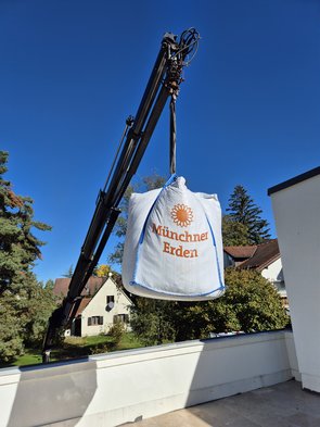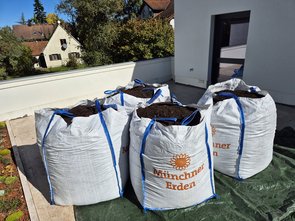 Dann gings los: eimerweise aus den Bigbags die wirklich tolle (und sehr leichte) Erde raus und runtergeworfen. Mama war am Anfang immer unten und hat die Bautenschutzmatten auf die Seite gedrückt und verteilt. Was für eine Sauerei! Ich musste die Big Bags zu 75% leeren, damit ich den Rest direkt aus dem Sack runterleeren konnte. Dann immer wieder runter und verteilt.