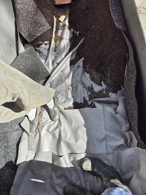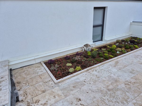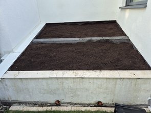 Heute Früh der Anruf vom Erdtransporter, ob er heute auch schon kommen kann. Wetter heut ja viel besser als morgen und Homeoffice war eh geplant. Also nach Bürorunde mit Mama den Blähton verteilt und das Trennvlies zur Erde (Rest von extensiver Begrünung auf Dachterrasse) zugeschnitten und verlegt. War knapper als gedacht.