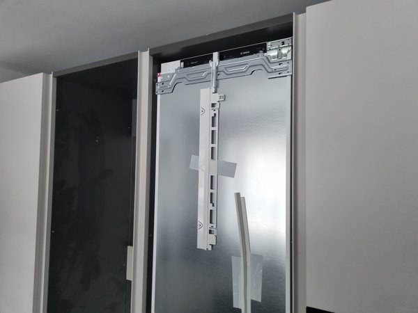 Kühlschranktür kann ich dann später mal machen, das muss ich erst lesen, welche Schiene da wo angebohrt werden muss und vor allem: auf welcher Seite man das Ausrichten anfängt. Die Schränke stehen perfekt in der Waage, der Kühlschrank ist 2 mm schief.