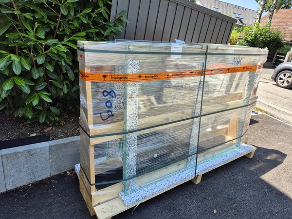 8-15 Uhr war vereinbart. Erst nach 14 Uhr kam die Fahrerin und hat die Gläser für die Absturzsicherung geliefert. Hab schon bissl Respekt, wie wir das Zeug montiert kriegen. 290 kg wiegt die Palette. Zum Glück war die Fahrerin so clever, dass sie es mir ganz auf die Seite geschoben hat, dass ich Auto noch in die Garage bringt. Hagel war zwar zum Glück nur ganz harmlos, aber das Glas ist ja nicht morgen montiert.